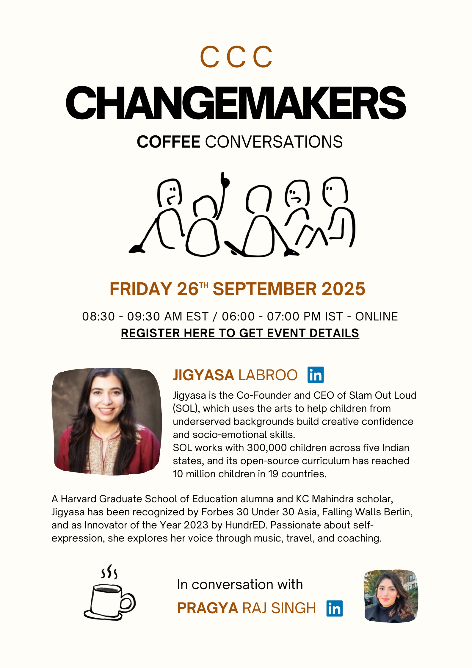 Craving fresh ideas and meaningful connections in the social impact space? This one’s for you.Changemakers Coffee Conversations (CCC) is back. Later this month, I’ll be in conversation with the incredible Jigyasa Labroo, whose work with Slam Out Loud is transforming how children build creative confidence and socio-emotional skills through the arts. We’ll dive into her journey, what shaped her path, the challenges she has navigated, and the vision that drives her forward.But CCC is more than just a conversation. It’s a space to connect with peers, exchange perspectives, and spark collaborations. Bring your questions and your curiosity, and be part of a community that, like you, believes in reimagining education and impact!